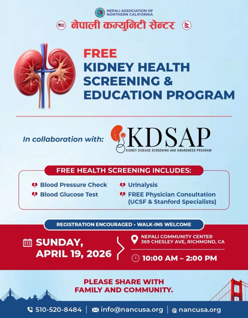The ๐—ก๐—ฒ๐—ฝ๐—ฎ๐—น๐—ถ ๐—”๐˜€๐˜€๐—ผ๐—ฐ๐—ถ๐—ฎ๐˜๐—ถ๐—ผ๐—ป ๐—ผ๐—ณ ๐—ก๐—ผ๐—ฟ๐˜๐—ต๐—ฒ๐—ฟ๐—ป ๐—–๐—ฎ๐—น๐—ถ๐—ณ๐—ผ๐—ฟ๐—ป๐—ถ๐—ฎ (๐—ก๐—”๐—ก๐—–), in collaboration with ๐—ž๐——๐—ฆ๐—”๐—ฃ โ€“ ๐—ž๐—ถ๐—ฑ๐—ป๐—ฒ๐˜† ๐——๐—ถ๐˜€๐—ฒ๐—ฎ๐˜€๐—ฒ ๐—ฆ๐—ฐ๐—ฟ๐—ฒ๐—ฒ๐—ป๐—ถ๐—ป๐—ด ๐—ฎ๐—ป๐—ฑ ๐—”๐˜„๐—ฎ๐—ฟ๐—ฒ๐—ป๐—ฒ๐˜€๐˜€ ๐—ฃ๐—ฟ๐—ผ๐—ด๐—ฟ๐—ฎ๐—บ, invites our community to a ๐—™๐—ฅ๐—˜๐—˜ ๐—ž๐—ถ๐—ฑ๐—ป๐—ฒ๐˜† ๐—›๐—ฒ๐—ฎ๐—น๐˜๐—ต ๐—ฆ๐—ฐ๐—ฟ๐—ฒ๐—ฒ๐—ป๐—ถ๐—ป๐—ด & ๐—˜๐—ฑ๐˜‚๐—ฐ๐—ฎ๐˜๐—ถ๐—ผ๐—ป ๐—ฃ๐—ฟ๐—ผ๐—ด๐—ฟ๐—ฎ๐—บ at the ๐—ก๐—ฒ๐—ฝ๐—ฎ๐—น๐—ถ ๐—–๐—ผ๐—บ๐—บ๐˜‚๐—ป๐—ถ๐˜๐˜† ๐—–๐—ฒ๐—ป๐˜๐—ฒ๐—ฟ.